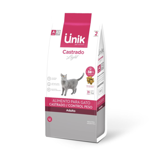 Unik Gato Castrado / Control de Peso Light es un alimento balanceado seco para gatos adultos esterilizados o con tendencia al sobrepeso. Es un alimento altamente digestible y palatable, diseñado específicamente para cubrir las necesidades nutricionales del gato, mientras se mantiene bajo en calorías. Para esto, su fórmula cuenta con el mix ideal de proteínas, minerales, vitaminas y fibras que permiten el mantenimiento sano del cuerpo y la mente del gato.